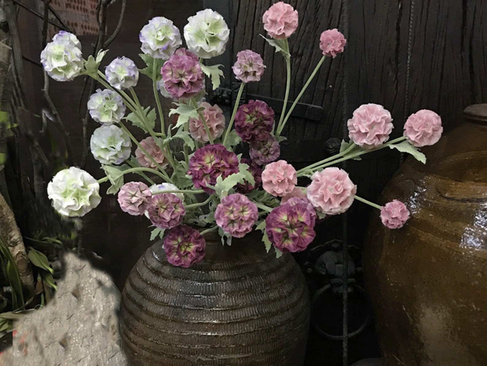 • Autumnal Table Centerpiece: For a fall-themed arrangement, pair dark purple Scabiosa with golden barley and a few sprigs of dried oak leaves. Place the arrangement in a wooden bowl or a terracotta pot for a cozy, autumnal vibe.