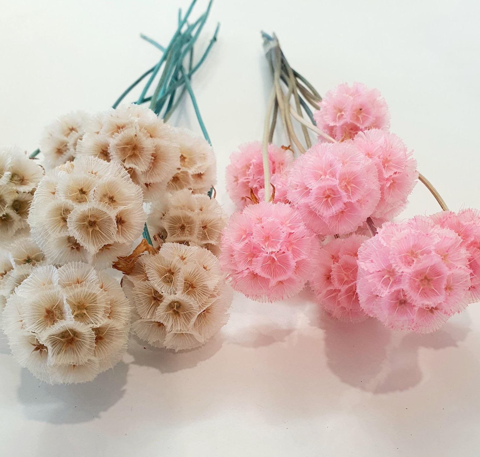 • Dried Scabiosa: Known for its soft, pincushion-like blooms, dried Scabiosa comes in various colors, including shades of purple, pink, and white. The texture of its petals is delicate, and the flower heads are often mounted on long, slender stems. Dried Scabiosa maintains its shape well and adds an element of lightness and airiness to arrangements.