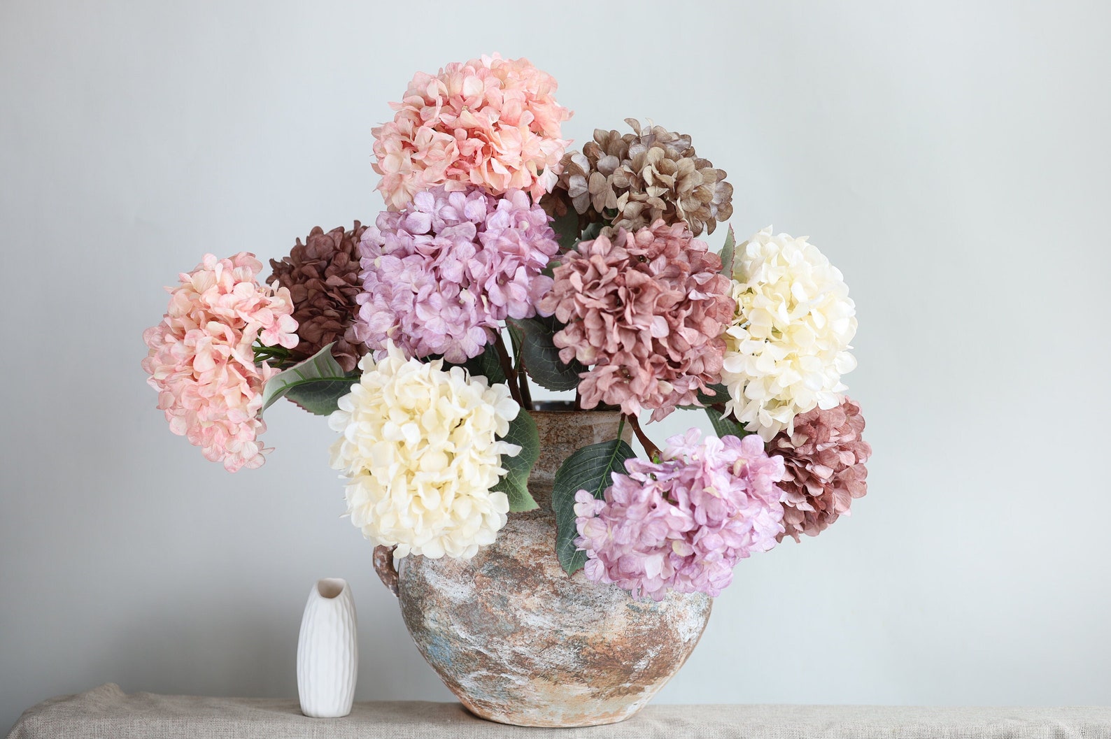 - Dried hydrangeas in earthy tones like beige, soft pink, or faded blue